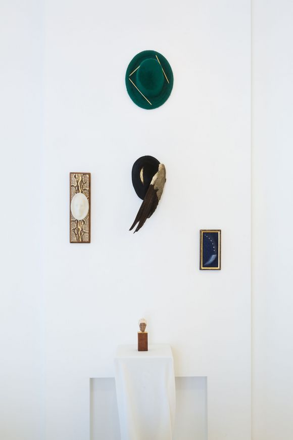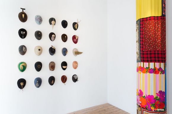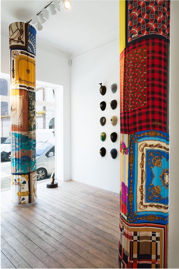L’artiste utilise des techniques et des codes liés au monde de l’art et à celui de la mode, du design et de l’artisanat (chapellerie, maroquinerie et taxidermie). Par la création d’objets sculpturaux, il questionne les moteurs de la construction de l’identité et rend ses objets portables. Dans cette exposition notamment, il se réapproprie les matières nobles et luxueuses qu’il utilise par exemple pour « Collective consciousness », des colonnes monumentales constituées d’une structure en bois et de carrés de soie.