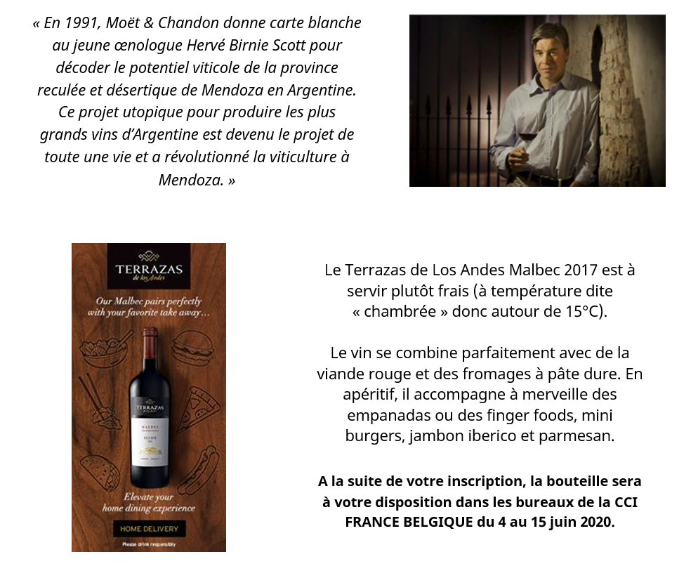 Découvrons ensemble le parcours en Argentine de cet entrepreneur français. Pour vous permettre une dégustation en direct de son vignoble argentin, la CCI FRANCE BELGIQUE vous offre une bouteille de Terrazas de los Andes.
