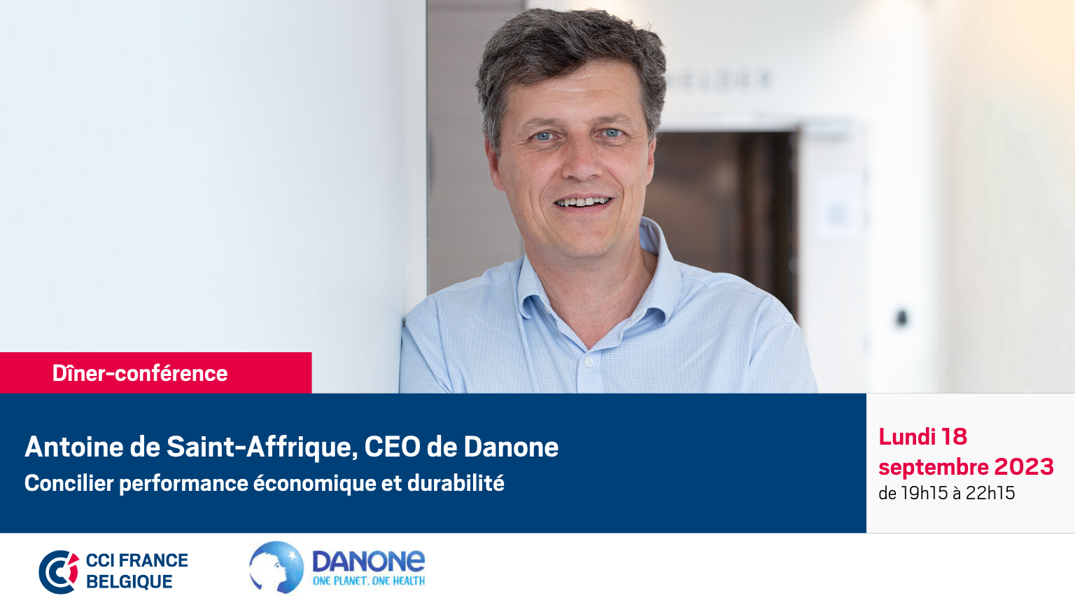 La CCI FRANCE BELGIQUE vous convie le 18 septembre 2023 à un dîner-conférence animé par Antoine de Saint-Affrique, CEO de Danone, autour du thème "Concilier performance économique et durabilité"