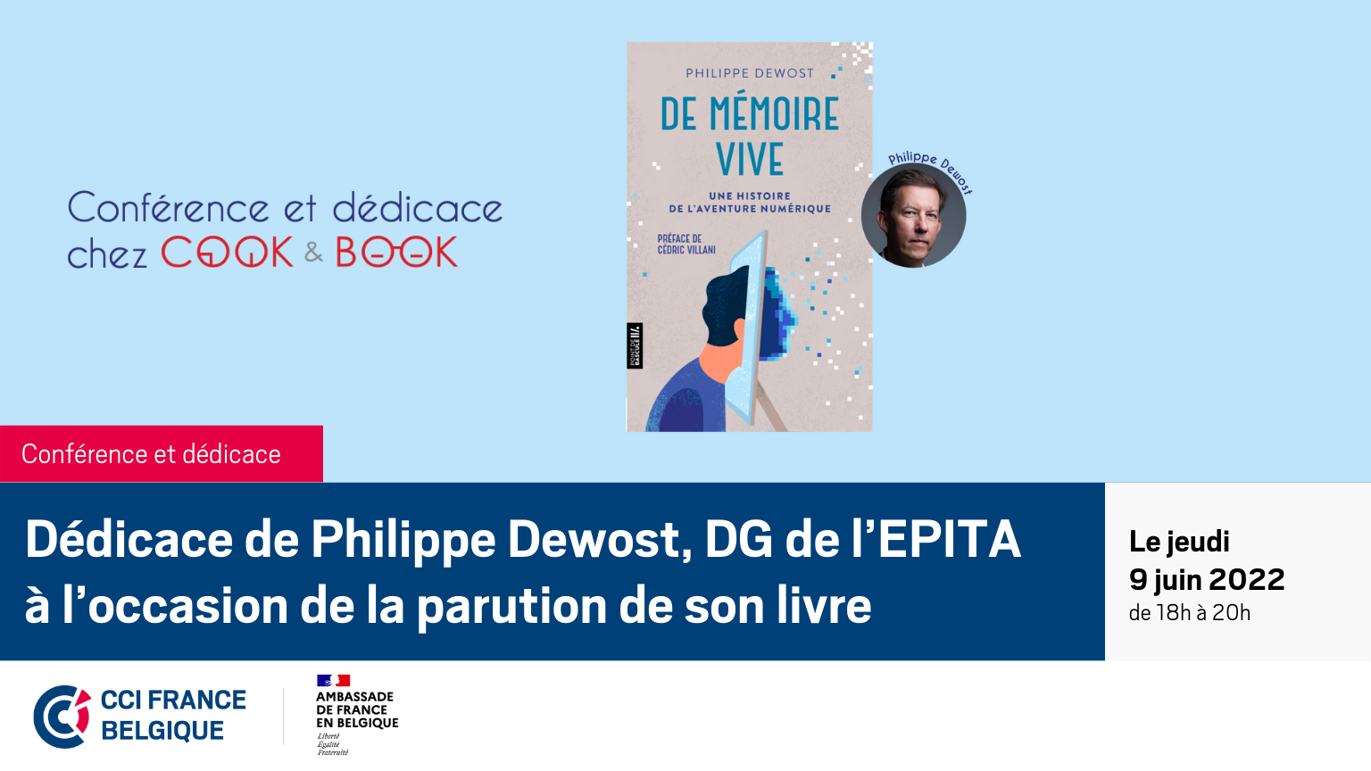 Retrouvez le jeudi 9 juin de 18h à 20h Philippe DEWOST, Directeur Général de l’EPITA: Ecole d'Ingénieurs en Informatique , à la librairie Cook & Book de Woluwe-Saint-Lambert, à l’occasion de la parution de son livre «De Mémoire Vive», préfacé par Cédric Villani.