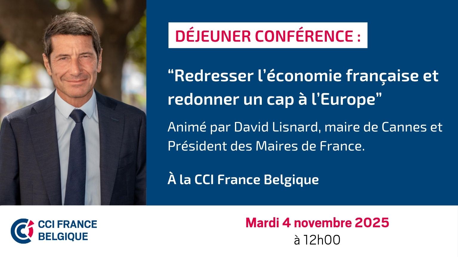 La CCI France Belgique a le plaisir d'accueillir Monsieur David Lisnard, Maire de Cannes, Président de l'Association des maires de France, et Président de Nouvelle Énergie, le mardi 4 novembre 2025 pour un déjeuner exclusif consacré au thème « Redresser l’économie française et redonner un cap à l’Europe ».