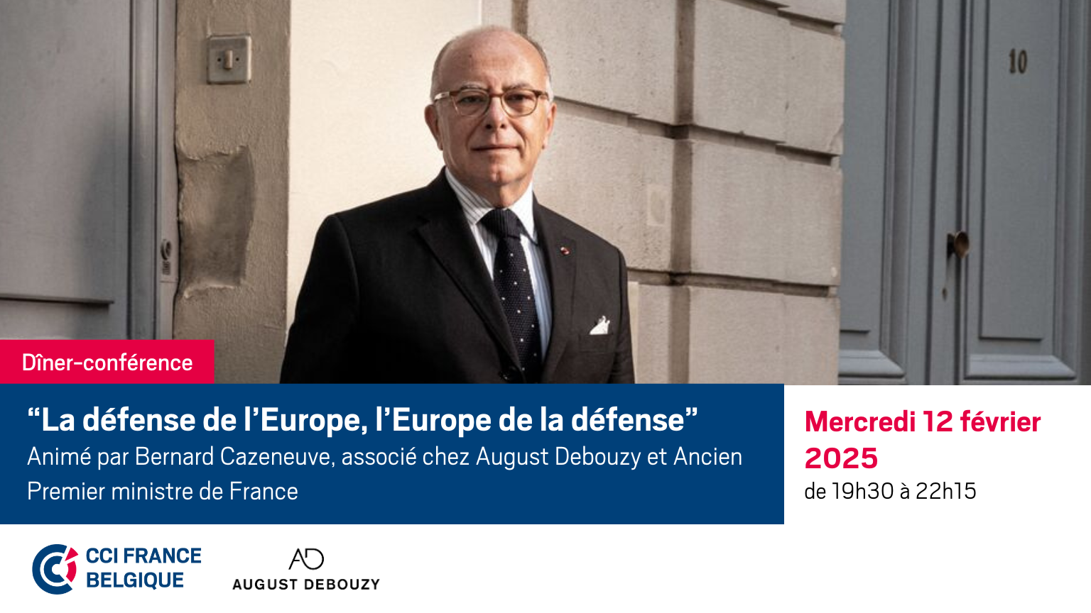 La CCI France Belgique a le plaisir de vous convier le mercredi 12 février à un dîner-conférence animé par Bernard CAZENEUVE, associé chez August Debouzy et ancien Premier ministre de France, autour du thème "La défense de l'Europe, l'Europe de la défense".
