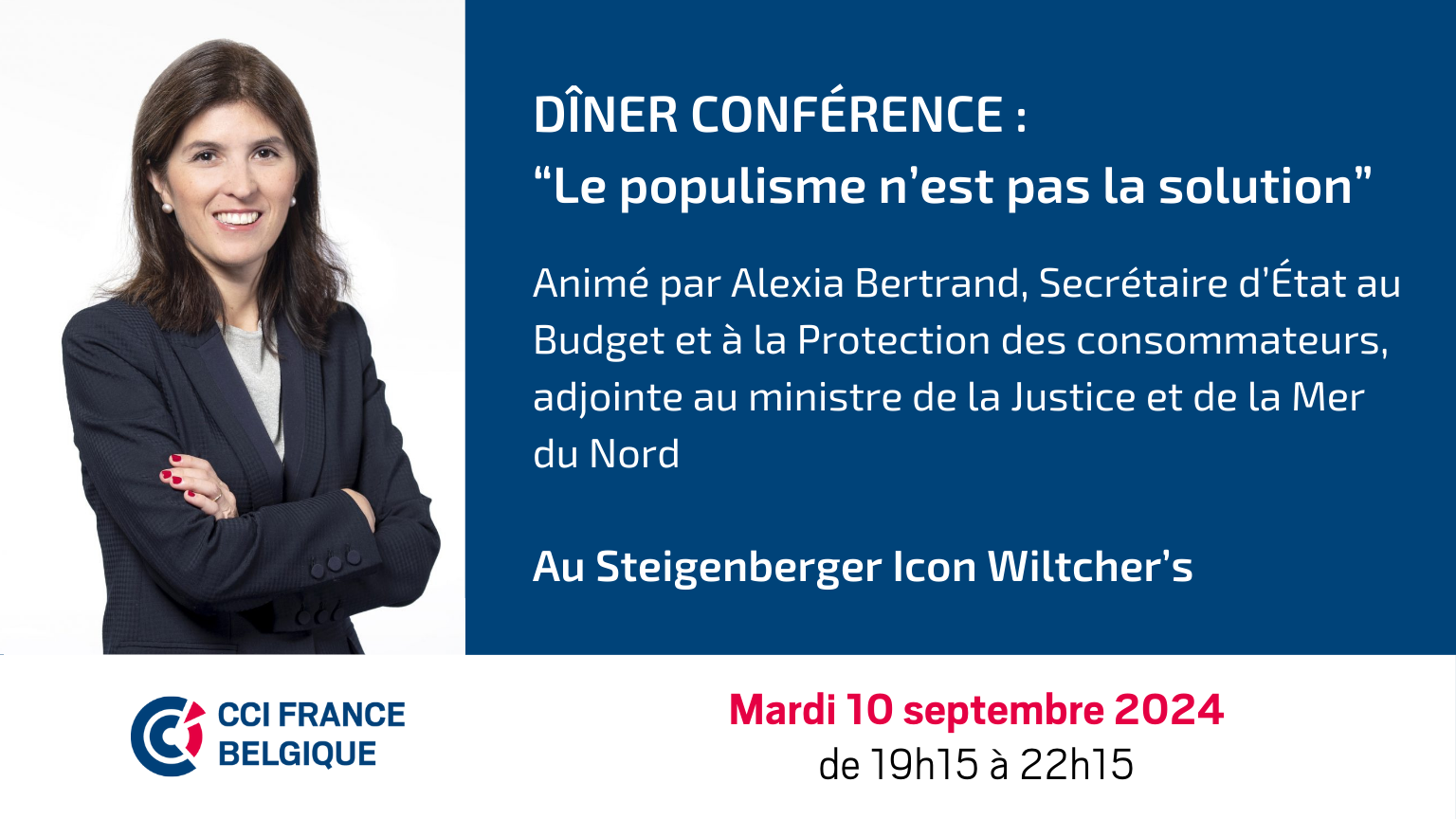 La CCI France Belgique aura le plaisir d'accueillir Alexia Bertrand, qui nous parlera des défis pour le futur dans notre société en évolution et pourquoi le populisme n'est pas la solution.