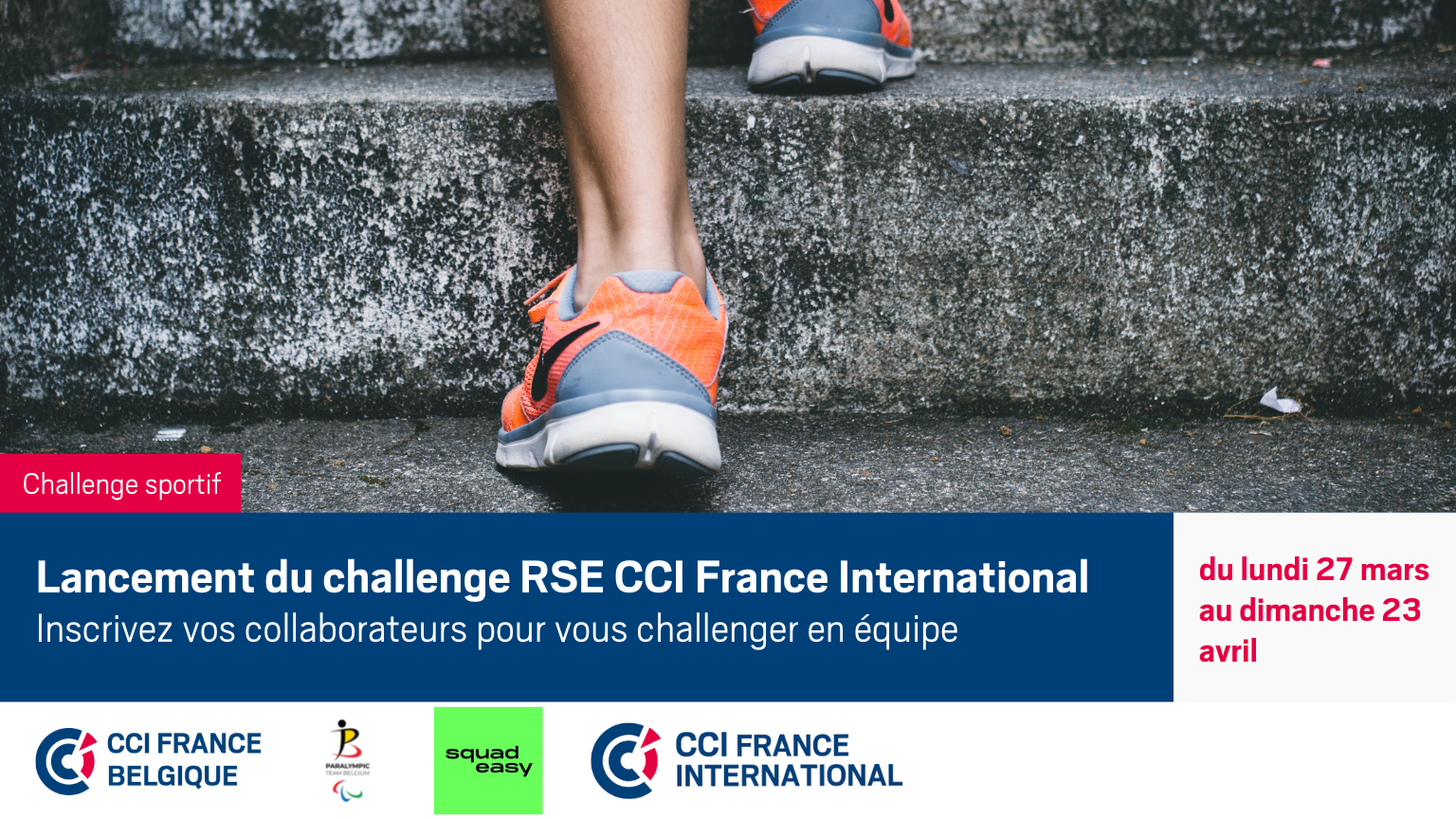 Pour sa deuxième édition, la CCI FRANCE INTERNATIONAL , réseau des CCI Françaises à l'international et la CCI FRANCE BELGIQUE vous proposent de participer à un challenge sportif organisé avec la startup Squadeasy.