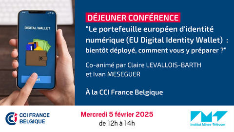 La CCI FRANCE BELGIQUE a le plaisir de vous convier le mercredi 5 février 2025 au déjeuner-conférence « Le portefeuille européen d'identité numérique (EU Digital Wallet) : bientôt déployé, comment vous y préparer ? » animé par Claire Levallois-Barth (Docteur en droit, Maitre de conférences en droit à IMT Atlantique) et Ivan Meseguer (Représentant de l'IMT auprès des institutions Européennes), co-fondateurs de la Chaire de recherche pluridisciplinaire Valeurs et Politiques des Informations Personnelles.