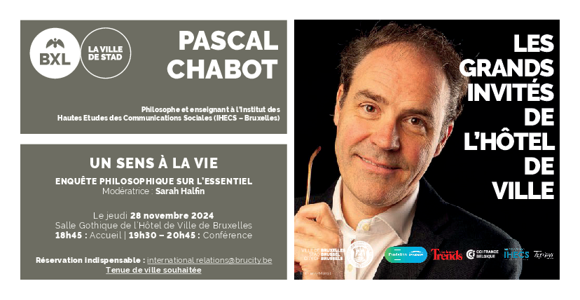 La Ville de Bruxelles a le plaisir de vous convier à la conférence « Un sens à la vie », qui se déroulera le jeudi 28 novembre 2024 et qui mettra à l’honneur Monsieur Pascal Chabot, Philosophe et enseignant à l’Institut des Hautes Etudes des Communications Sociales (IHECS – Bruxelles).