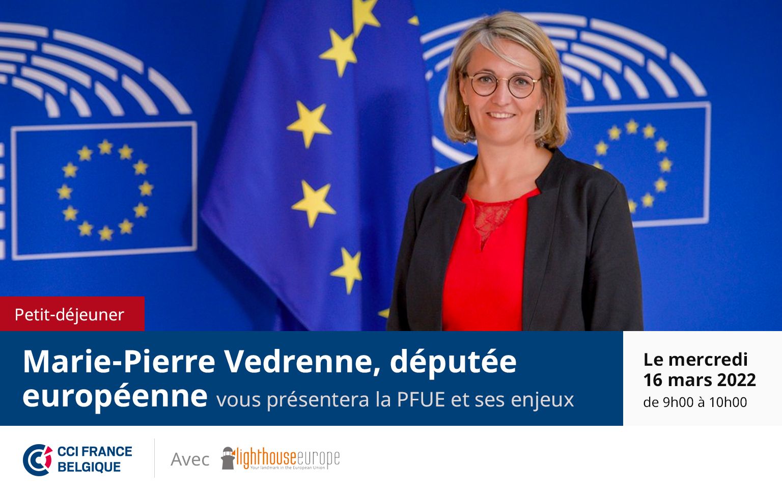 La CCI France Belgique vous convie à un petit-déjeuner conférence le mercredi 16 mars 2022 de 9h à 10h dans ses locaux (23, rue de la Loi) dans le cadre de son cercle thématique sur la Présidence Française du Conseil de l'Union Européenne (PFUE).
