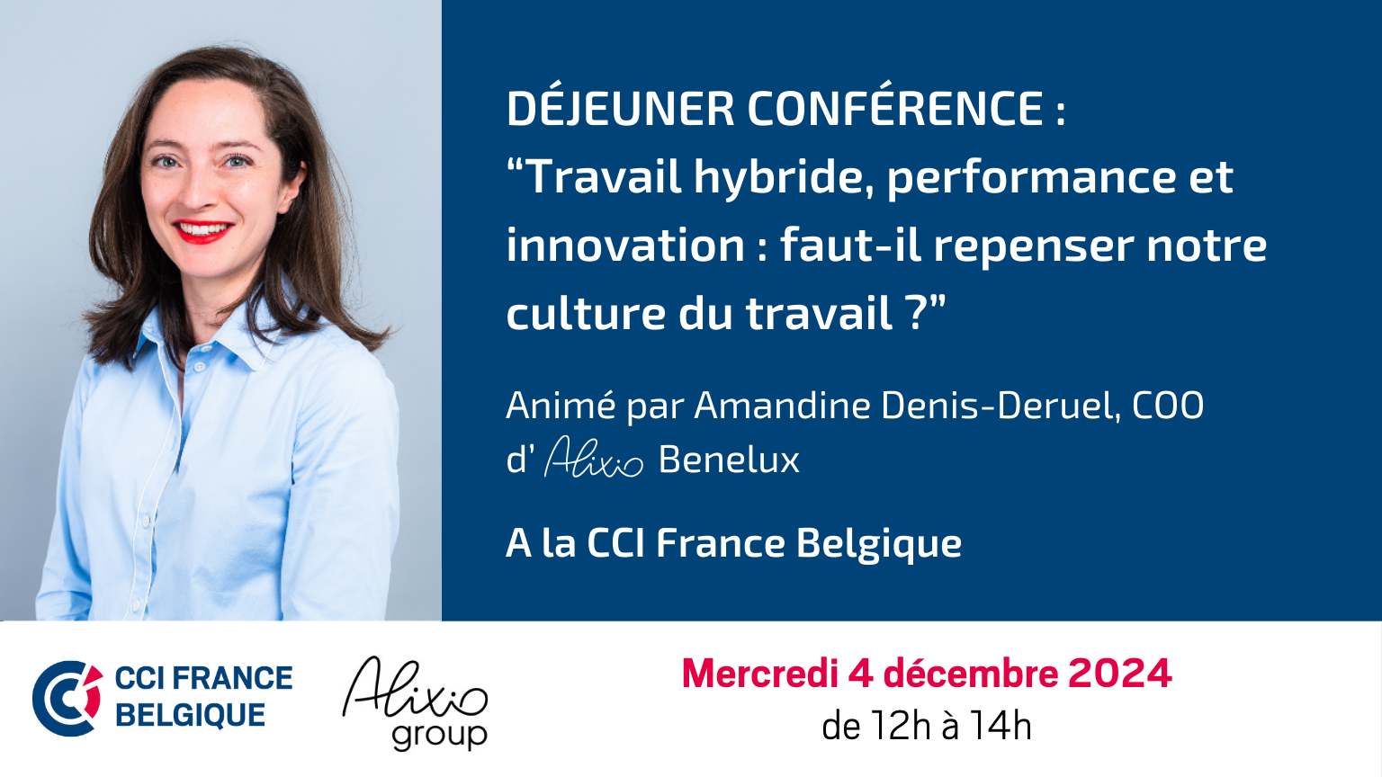 La CCI FRANCE BELGIQUE a le plaisir de vous convier le mercredi 4 décembre 2024 au déjeuner-conférence « Travail hybride, performance et innovation : faut-il repenser notre culture du travail ? » animé par Amandine DENIS-DERUEL, Chief Operatif Officer chez Alixio Benelux.