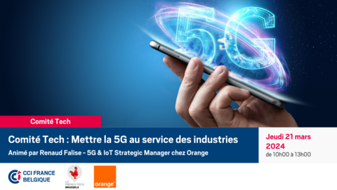 La CCI FRANCE BELGIQUE et LA FRENCH TECH BRUSSELS ont le plaisir de vous convier le jeudi 21 mars 2024 pour un déjeuner du Comité Tech animé par Renaud Falise, 5G & IoT Strategic Manager chez Orange. Compte tenu de l'exclusivité de ce rendez-vous, les places sont limitées à 15 personnes.