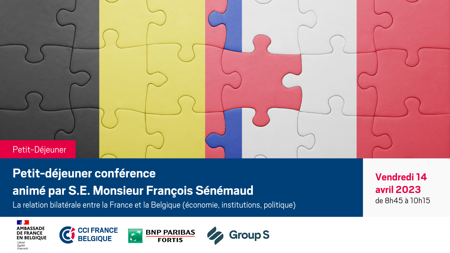 9h15 - 10h15 : Conférence suivie d’un temps d'échange avec S.E. Monsieur l'Ambassadeur, Monsieur Arnaud Boulanger, Chef du Service Economique de Bruxelles et Monsieur Thomas Michelon, Conseiller de coopération et d’action culturelle