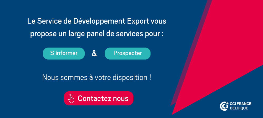 L’équipe d’experts sectoriels du Service de Développement Export (S.D.E) vous accompagne dans votre projet de développement à l’export, que ce soit de la France vers la Belgique ou inversement. Elle propose une palette de services allant de l’étude de marché à l’organisation d’évènements B2B en passant par la prospection. Ces prestations se répartissent selon plusieurs filières : Tech & services innovants ; Industrie & Cleantech ; Agroalimentaire, Vins & Spiritueux ; Arts de Vivre et Santé.